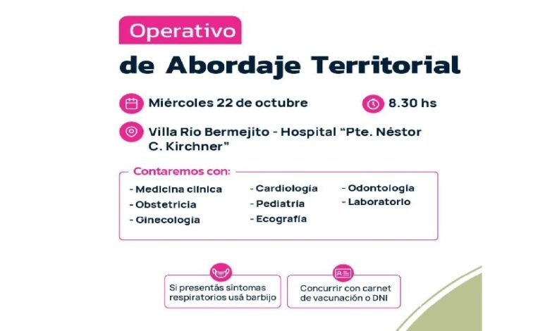 El Ministerio de Salud del Chaco desplegará un operativo sanitario territorial los días 21 y 22 de octubre en las localidades de Villa Río Bermejito y El Espinillo, con el objetivo de acercar la atención médica integral a comunidades de El Impenetrable.